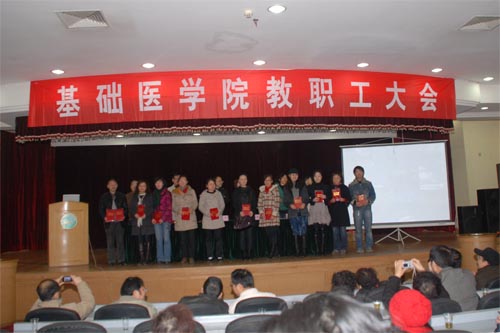 大会对基础医学院2010年度5个先进集体:人体寄生虫学教研室、人体解剖学教研室、微生物学教研室、病理生理学教研室、机能学实验室,2个进步团队:生理学教研室、数学教研室及考核优秀的23名教师进行了表彰。