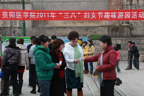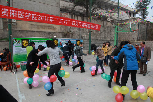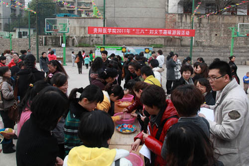 3月8日下午,根据学院党委的安排,由院工会主办、后勤分工会承办的贵阳医学院2011年“三•八”妇女节女教职工趣味游艺活动在学院篮球场举行。300余名女教职工参加了此次活动。